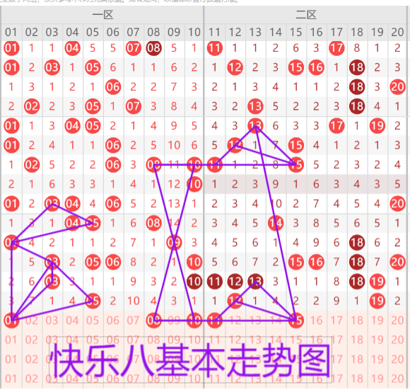 我们来看下一区的基本走势情况,上期开出了3枚开奖号码,走出了低位走势,本期预测会在均值五枚附近,首先我们来看01的形态号对撑走势,08 10 11 15如图中所画线,形态四码建议最少四选二或者四选三。
