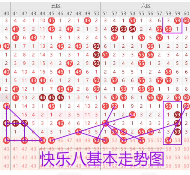 我们来看下三区的基本走势情况,上期开出了6枚开奖号码,本期预测三区有小高位走势,首先我们来看三角形态的40 42 44是否能开出2枚开奖号码,或者带着41开出二连号,45的第四期走势,或者看51的回头走势,建议二选一,50的三斜连形态,可以考虑50 51的二连走势,53 55重号走势二选一,58的三斜连边码58 60二选一。