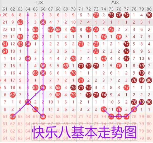 我们来看下四区的基本走势情况,上期开出了4枚开奖号码,本期预测基本也就在4-6枚之间,首先我们来看62冷号开出回补带斜三连走势,66的形态斜连第二期。7头的75 76 77同形态三码建议考虑二连或者三连走势。