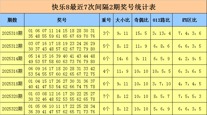 福彩快乐8第2025322期开出奖号:01 05 06 10 11 17 22 25 28 34 36 39 41 47 57 62 65 71 73 76,其中奖号奇偶比为12:8,大小比为8:12,012路比为4:8:8,四区比为6:6:3:5,包含2个重号71、76。