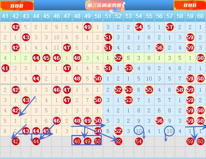 上期开出的43 44 45号这个三连号,本期很看好它会落一码下来,可以在44 45号数值中认真作防选一胆码出来。上期48 49 50号这个三连号落下了50号数字,本期有望继续落号,我们可以在这里考虑选一胆码的。在52号到62号数字之间有一组同期遗漏10期的号码为54 57号,预测最近三期是要落的,本期我们就作为防守号来用,如果本期不出号,那么后两期就可以作为胆码来用了。上期的59 60号这个两连号上期没落号,本期可以防守一下它两的落号情况。