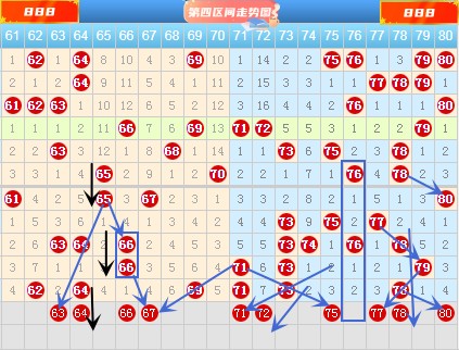 上图中63号又是62 64号的夹号又和64 65号形成了3斜连,本期可以关注一下。上期在61-70号数字区间开出了3个号码,本期很看好会出一个重号,这里可参考64 69号数字的重号出号情况。65 67号以重号66号形成了拐角对位,前面分析中也是有一组这样类型的号码组合,所以本期的40 67号数字大概率会开出一码吧。在71-80号数字区间上期也是开出了3个号码,这里也是看好会出一个重号,可以参考71 78号数字出重号。75号数字和71 73号数字形成了3斜连,76号数字是空二对称类型,77号数字和78 79形成三斜连,那么有没有一种可能,本期会开出75 76 77号这个三连号呢?还是有必要防守一下的。上期开出了73 78号数字,那么本期我们就要重点关注76 80号数字的出号情况了。好了,本期分析就到这里了。