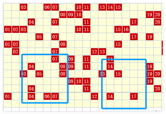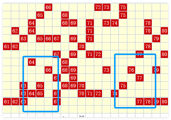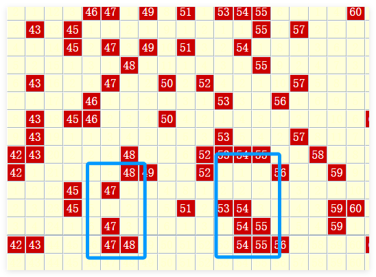 上期开出了7个重号(11、39、54、59、63、65、70)以及三组连号(54-55、63-64-65、70-71-72),重号和连号形态较为突出。