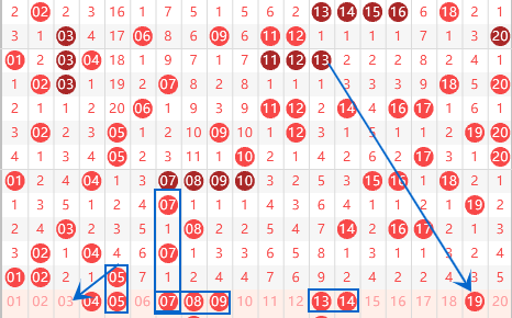 本期的04号数字我们可以注意一下,它是属于421走势,出号机会还是有的。05号数字我们要注意走重的情况,所以本期我们要注意一下04 05同出的情况。本期的07 54号数字是一样的类型,本期我们要注意出一个号码的情况。连号09 10已经遗漏4期没有落号了,本期我们要注意落下一个号码的情况,重点关注一下09号数字。连号空一带号14 16 17已经遗漏2期没有出号了,本期我们要防守一下落下两个号码的情况。
