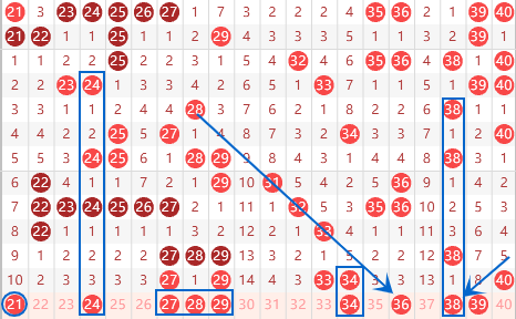 本期的21号数字是属于遗漏10期的号码,本期遗漏10期的号码有2个,本期的2个号码走势都很好,所以本期我们可以在这里定一个胆码的。连号23 24 25 26已经遗漏3期了,本期我们要注意落下两个号码的情况,重点关注一下23 24的出号情况。本期我们要注意一下27 29出三重的情况,这里可以挑一个号码做一下。上期开出了33 34连号,本期我们要注意出重号的情况。