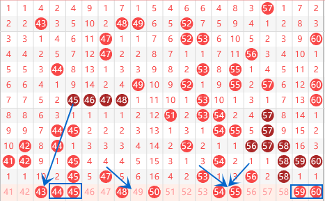 上期开出了33号数字,本期我们要注意一下44号数字的出号情况,所以这里我们要注意三连号43 44 45的出号情况。本期的48号数字我们可以关注一下,上期开出了47号数字,有可能会把本期的48号数字带出来的。本期的54 55我们要注意一下。出一个号码的情况还是有的,两个都有很好的走势,可以重点关注一下。本期的60号数字我们可以关注一下,它的走势和54 56的走势有点相似,还是有机会出来的。