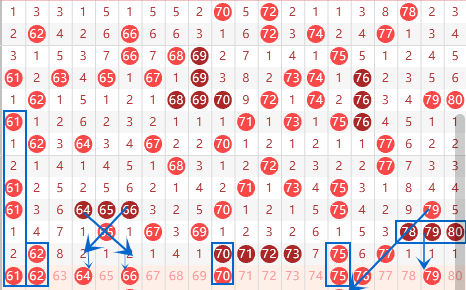 本期的61 64都是空二对称,我们要注意出一个号码的情况,上期的71 73空二对称就都出了,所以本期的61 64应该也是会出号码的吧。上期开出了4连号码70 71 72 73,本期我们要注意出重号的情况,重点关注一下70号数字的出号情况。本期的75号数字我们要注意走重的情况。三连号78 79 80我们也是要注意落下号码的情况,重点关注一下78 79的落号情况。