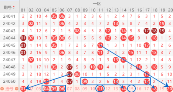 本期的01号数字我们注意一下出号情况,从012路图上看出号机会是很大的,我们要注意一下。本期的04号数字我们也是要注意一下,本期有可能会01 04同出的。本期的05 06号数字我们注意一下出一个号码的情况,重点关注一下06号数字的出号情况。本期的11 15号数字都是属于空三中心号,本期的空三中心号码有4个,本期是应该出一个的,所以本期的11 15是大概率要出一个号码的,我们要重点关注一下。本期的20号数字我们注意一下出号情况,属于大长斜连,做一下防守就行了。