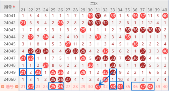 该区间的22号数字我们注意一下出号情况,属于对称走势号码,出号机会是有的。上期开出了25 26 27号数字的三连号,本期我们注意一下出重号的情况,重点关注一下25 26号数字出重的情况就行了。本期的31号数字我们注意一下出号情况,属于123走势,本期的123走势有2个,是有机会出一个号码的。本期的34号数字是属于遗漏10期的号码,本期遗漏10期的号码有三个,本期我们要注意出一个号码的情况。本期的36 37 38号数字我们注意出一个号码的情况。