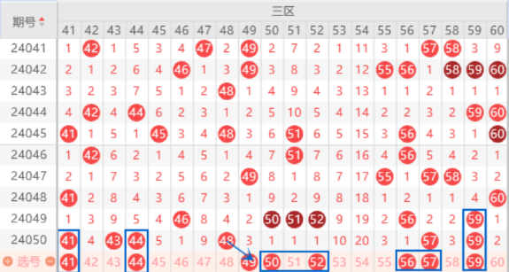 上期开出了连号空一带号的情况,本期我们关注一下出重号的情况,重点关注一下41 44号数字的出号情况就行了。本期的49号数字我们注意一下出号情况。三连号50 51 52号数字上期没能开出重号来,本期我们注意落下一个号码的情况,重点关注一下50 52号数字的出号情况就行了。上期开出了57 59 61 62号数字,那么本期这里应该也是有重号出现的,我们重点关注一下57 59号数字出一个重号的情况就行了。
