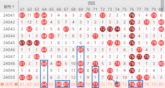 本期的63 64号数字我们注意出一个号码的情况,重点关注一下64号数字的出号情况。本期的67号数字是属于遗漏7期的号码,本期遗漏7期的号码有5个,本期我们要注意出2个号码的情况。本期的69 71号数字我们注意落下一个号码的情况,重点关注一下71号数字的出号情况。本期的74号数字我们注意一下出号情况。上期开出了77 78号数字,本期我们注意一下出重号的情况,重点关注一下77号数字出重号的情况就行了。
