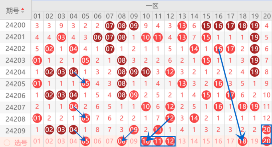上期开出了02 03 04号数字的的三连号,本期我们注意一下04号数字的出重的情况。本期的05号数字我们也是要注意一下出号情况。本期的08 10号数字我们注意一下同出的情况。上期开出了09 11号数字,本期我们注意一下出一个重号的情况。本期的15 16 17号数字本期我们就可以放弃了,本期出号机会不大。本期的18号数字我们注意一下出号情况,可以防守一下18 20号数字同出的情况。