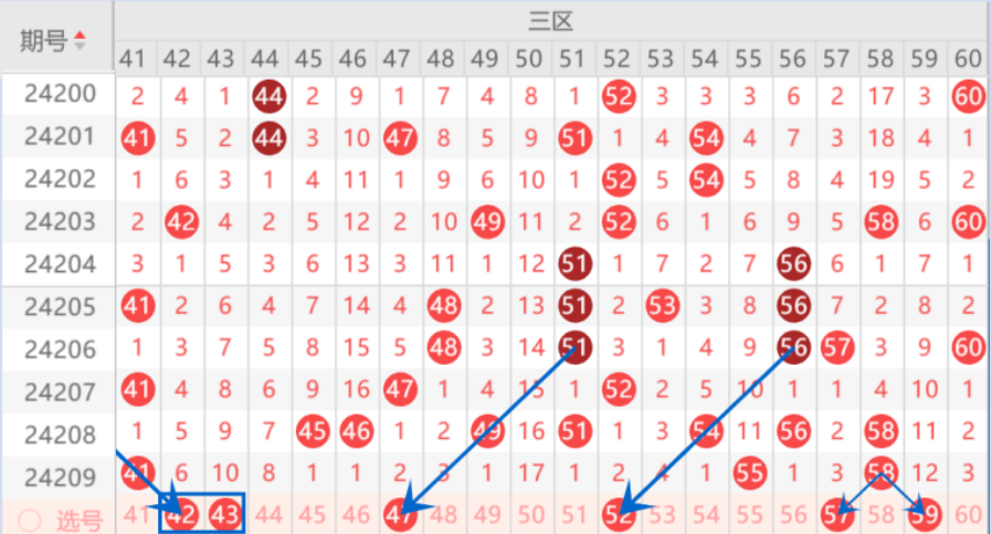 本期的41号数字我们注意一下出重的情况,可以防守一下。本期的42 43我们注意一下出一个号码的情况,重点关注一下42号数字的出号情况。本期的47号数字我们防守一下出号情况就行了。本期的52号数字我们重点关注下出号情况,本期出号机会很大的。上期开出了58号数字的重号,本期我们注意一下走分边的情况。