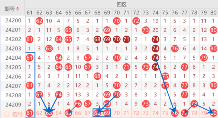 本期的61号数字我们注意一下出号情况,本期可以防守一下61 63号数字同出的情况。上期开出了连号空一带号66 67 69号数字,本期我们注意一下出一个重号的情况,重点关注一下69号数字出重的情况,如果本期的68号数字出号了,那么本期的66 67 69号数字出重的机会就很小了。本期的76 77号数字我们注意一下出一个号码的情况,重点关注一下77号数字的出号情况。本期的80号数字我们关注一下出号情况。