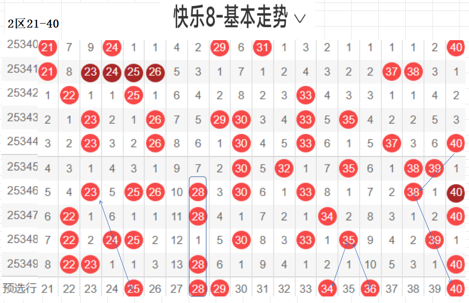 二区(21-40):遗漏5期以下有15,022 23 28 40  4,数据所示,冷码平均,选择条件增多了.上期开出了4个号码,出码比较分散.这期布防相应增加,重码按比例落这区较少,先给出关联码25,这个区间间接走势,温区,21-30区间上期开了3个,依旧不是重点选号区间,31-40区间开出1个,本期关注热码的回补,间隔小遗漏值最佳,3字头转热,这个小区热码注意回调,可以做关联码的布局,注重温冷码的回补.