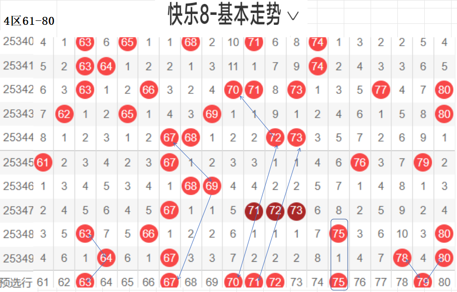 四区:(61-80):遗漏5(5)以下有15,064 67 78 80  4,平均温开方式,上期开出4,区间回暖,后区可防,区间从以往数据来看,重码很强,一枝独秀的存在,近期有回补走热的趋势,区间回暖,本区间后区可防,与一区相比,也是温区.,对称下落,隔期回补码,可以防,这区对呈对称三角关系的胆码,斜三连有走势的胆码,联动落位码,都有各自的走向落位关系,根据走势选择一种方式选码.
