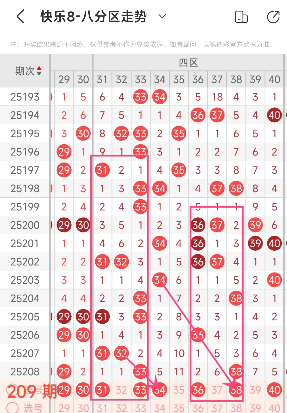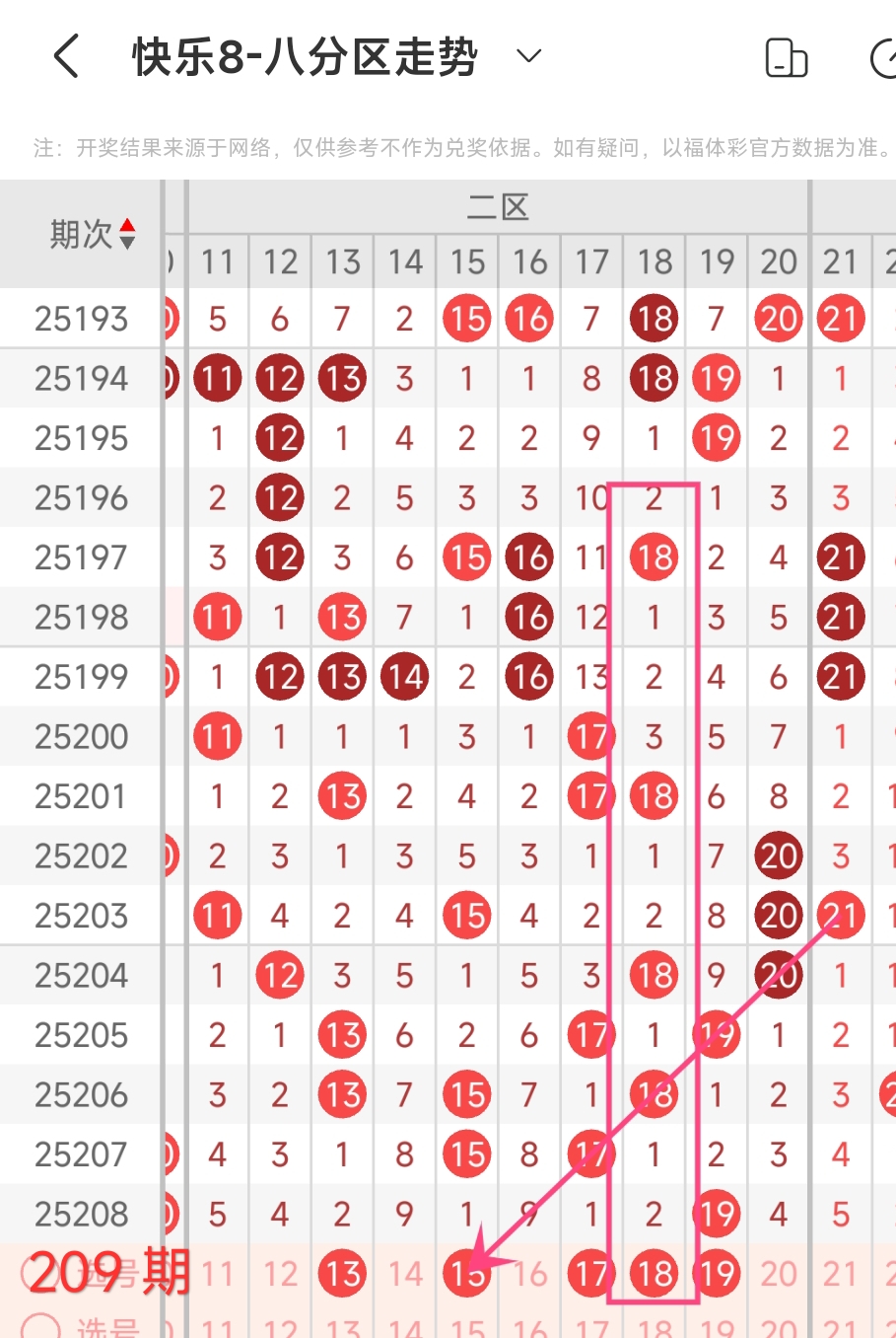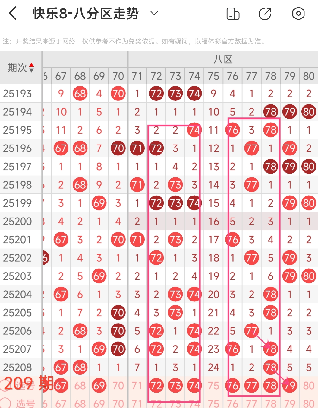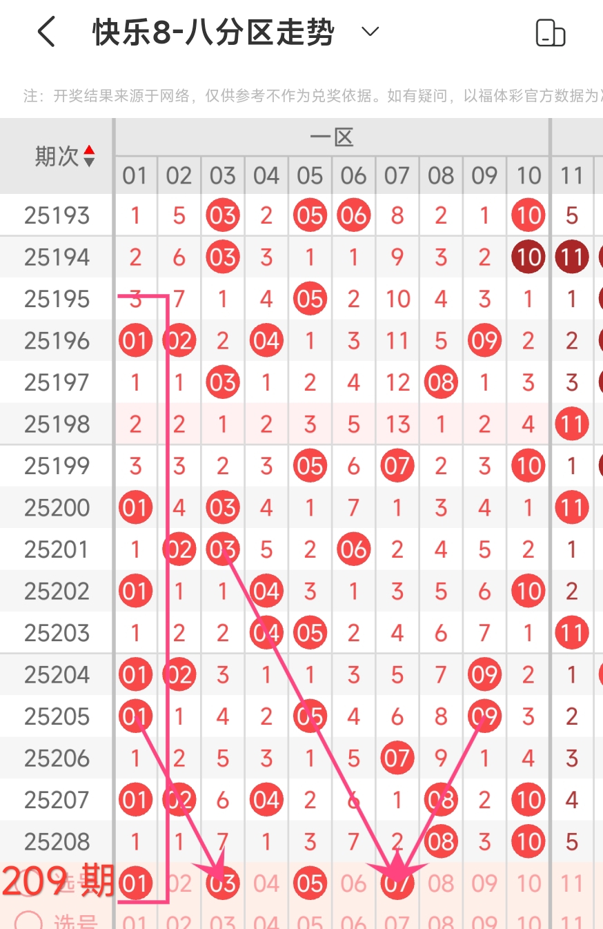 在快乐8的探索之旅中,通过对开奖走势图细致入微的观察,我们总结出一些具有参考价值的规律。几乎每一期开奖号码都呈现出以下显著特征:其一,大概率出现连号;其二,常常伴有边码;其三,遗漏值为1 2 3的号码频繁现身;其四,重号现象也较为常见。掌握这些要点,能为我们的投注提供方向指引。我们约定采用八分区走势图来展开分析。