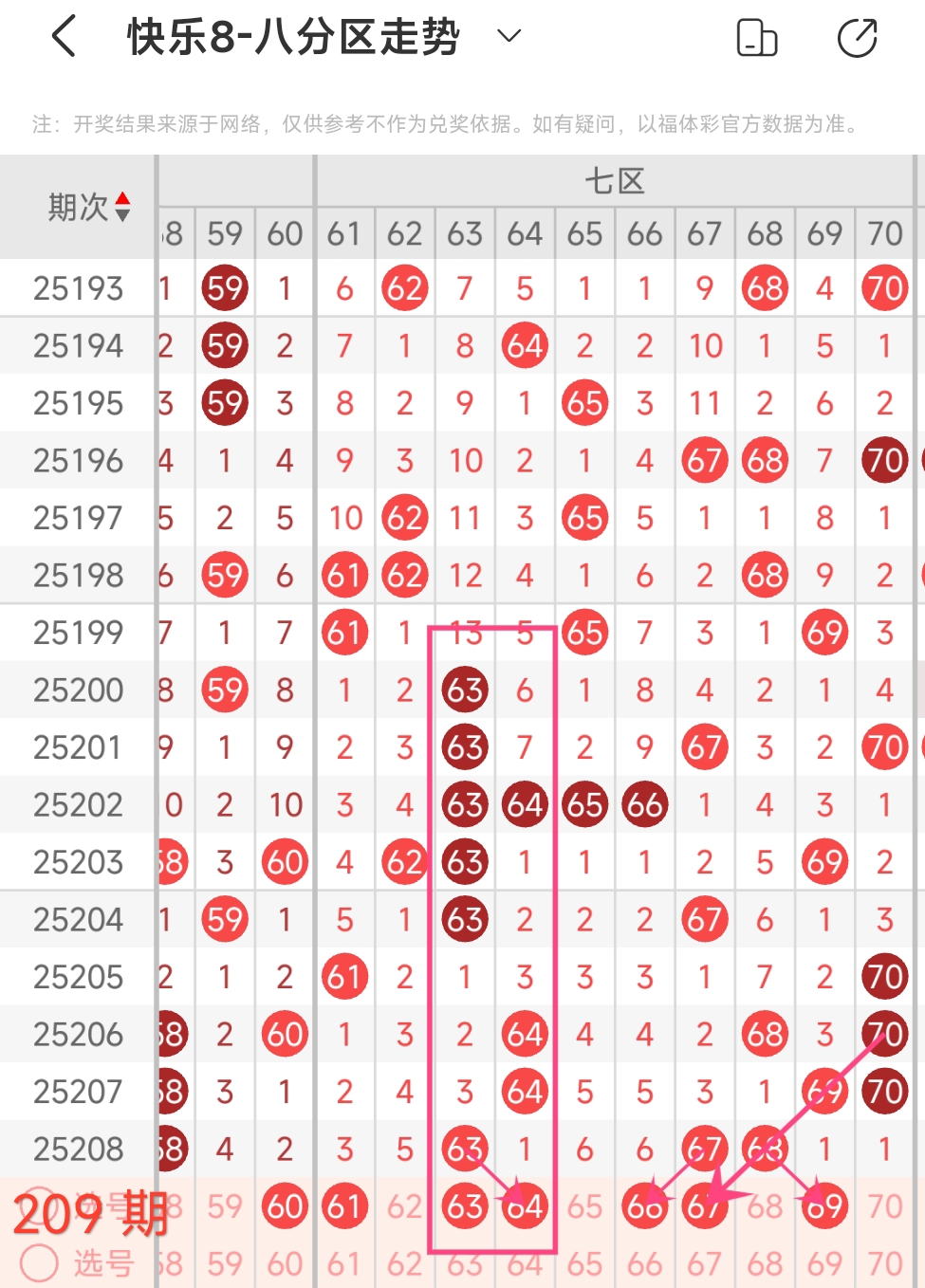 上期七区开出63 67 68这3个号码,本期考虑出2个左右。
