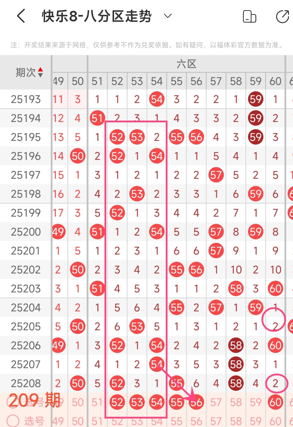 上期六区开出52 56 58这3个号码,本期应该出2个。