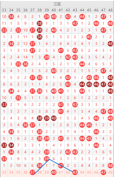 边号37 39 40 42 47出1-2码,重号38 41 48三出一,优先41,形态上37 43是斜连号,上图已勾画,看不上43可以用33,3开头边号出多期本期37比较合适,防4尾44回补,本期看好3开头1-2码,4开头出2码,结论关注五码33 37 41 44 47防43,一胆41双胆33 41