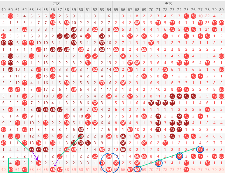 边号50 52 53 55 62 64出1-2码,重号51 54 63三出一,看上图勾画,形态上64是梅花,56跟上面54一样是错位回补,其次凤尾出边号,本期62 64二出一,4尾最热,54 64二出一,54如果不出重号,63就要走重,遗漏值57 62 64三出一,本期四区龙头要有边号50 52二出一,结论关注五码50  57 62 63 64,防56,一胆50三胆50 57 63