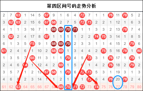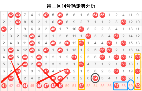 第三区间最好的走势真的下来了,42 48 49这样的号码真的是不常见。然后三区作为我们今天预计要主打的区间,不知道各位有什么看法?欢迎大家在评论区留言。这一期上最显然的号码应该是59了,好的走势能不能在这一期带下来,成为当前我们需要密切关注的话题,而且与四区77能不能形成同起同落的走势,这是当前大家要关注的地方了。另外大家多思考一下图中两个画圈的号码。