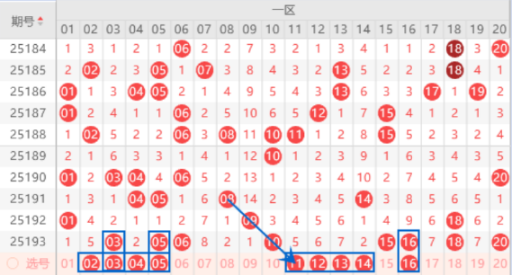 该区间上期开出了03 05 06号数字的连号空一带号,本期我们注意一下出重号的情况,其中的03 05号数字可以重点关注一下。本期的夹号04号数字我们可以重点关注一下出号情况,本期这里可以防守一下03 04号数字或者04 05号数字同出的情况。本期的11 12 13 14号数字我们注意一下出号码的情况,其中的12 13号数字可以重点关注一下出号情况。上期开出了15 16 18号数字,本期我们注意出一个重号的情况,其中的16号数字可以重点关注一下。