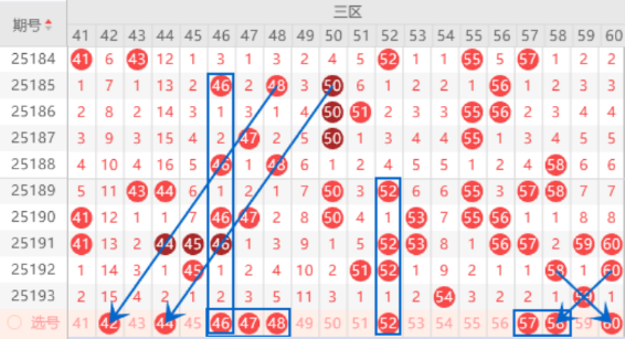 该区间的42 44号数字是属于斜连号码,出号机会是有的,我们可以防守一下同出的情况。本期的44 45 46号数字是属于交叉对称号码,本期是有机会出一个号码的,我们可以关注一下。本期的47 48号数字我们也是要注意出一个号码的情况,其中的48号数字可以重点关注一下。本期的52号数字是属于空一对称号码,出号机会也是有的,可以关注一下。本期的58 60号数字是属于交叉对称号码,出一个号码的机会也是有的,可以关注一下。