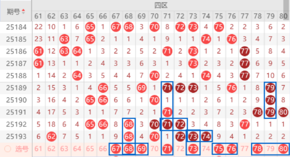 该区间上期开出了68 70 72号数字的重号,本期我们注意一下出三重的情况,其中的68 72号数字我们可以重点关注一下出号情况。该区间的67 75号数字都是属于遗漏9期的号码,本期我们注意出一个号码的情况。本期的夹号69 71号数字我们注意出一个号码的情况,其中的71号数字可以重点关注一下。上期开出了三连号72 73 74号数字,我们也是要注意出一个重号的情况。本期的78 79 80号数字是属于重号79号数字的边号回补号码,本期出一个号码的机会是很大的,我们重点关注一下78 80号数字出一个号码的情况。