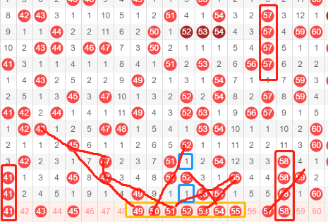 第三区间号码41-60,三区这个走势做出来之后有点吓人,居然形成众多的连号一起出现,但这毕竟也算是一种希望吧。尤其是号码58,能不能模仿前面57走出四重号,这值得我们研究一下。其余的49-55这些号码,都是当前比较在走势上占据主导地位的号码。