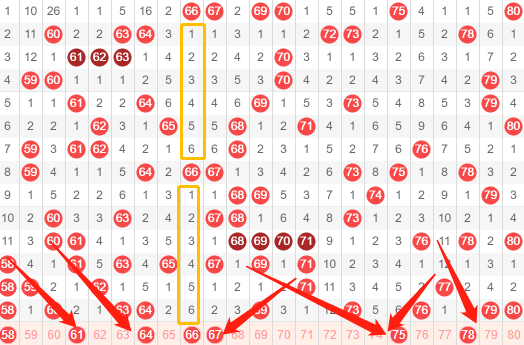 第四区间号码61-80,既然四区右转热的迹象,可以适当做一下,不用也太过于关注,毕竟这种边缘区域不是我们经常思考的地方。注意黄色框框标注的地方,已经出现等期遗漏。二61和75是这一区间里面走势上比较看好的地方,不妨多做分析。