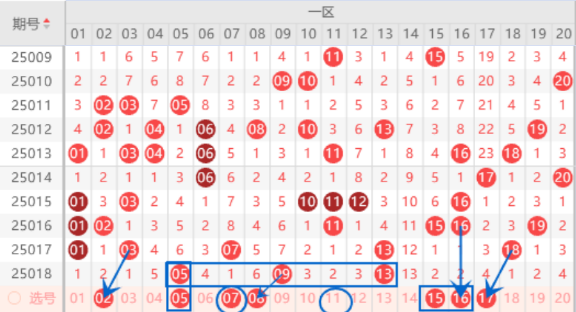本期的07 13号数字是属于空三中心号,本期的空三中心号有4个,出一个号码的机会是很大的,所以本期的07 11号数字我们要注意出一个号码的情况,其中的07号数字我们可以重点关注一下。上期开出了05 09号数字,我们注意出一个重号的情况,如果本期的05 09号数字不出重号,那么本期的06 08号数字我们就要注意出一个号码的情况了。本期的15 16号数字我们要注意落下一个号码的情况,其中的15号数字我们可以重点关注一下出号情况。