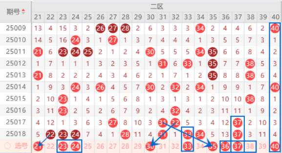 上期开出了三连号22 23 24号数字,本期我们要做注意一下出重号的情况,其中的23 24号数字我们可以重点关注一下出重号的情况。本期的21号数字我们防守一下出号机会,是属于连带关系号码,本期是有机会出号的。本期的29 30号数字我们要注意出一个号码的情况,其中的30号数字我们可以重点关注一下出号情况。上期开出了31 33 34号数字的连号空一带号,本期我们注意一下出重号的情况,其中的33号数字我们可以重点关注一下出号情况。