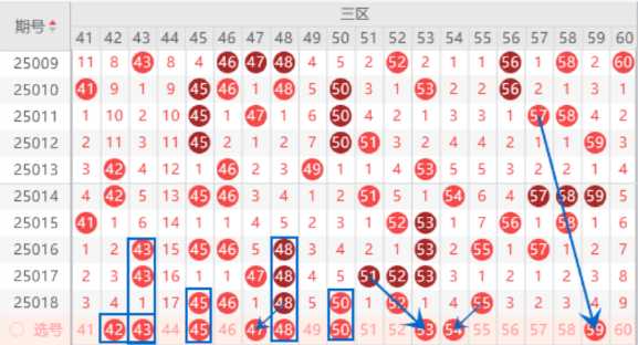 本期的40 42号数字是属于交叉对称回补号码,本期出一个号码的机会是比较大的,我们可以重点关注一下出号情况。上期开出了45 46 48 50 52阿訇数字,本期我们要注意出重号的情况,其中的45 48 50号数字我们可以重点关注一下出重号的情况。本期的夹号47 49 51号数字我们也是要注意出一个号码的情况。本期的53 54号数字我们也是要注意出一个号码的情况。本期的56 57 58号数字有断号的风险,我们就直接放弃了。