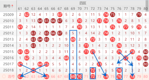 本期的61 65号数字是属于交叉对称号码,本期我们要注意出号情况,其中的65号数字我们可以重点关注一下出号情况。本期的69号数字是属于空五对称号码,出号机会是有的,我们可以防守一下69 70号数字同出的情况,上期开出了72 76号数字,本期我们注意一下出一个重号的情况。本期的74号数字也是属于空三中心号码,可以关注一下出号情况。
