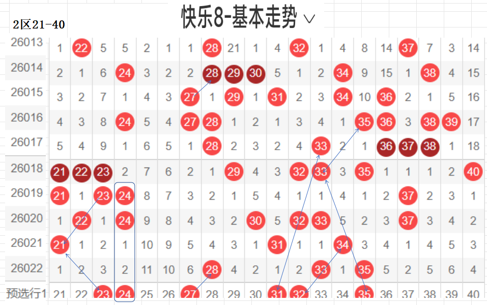 二区(21-40):遗漏5期以下有16,028 33 35  3,数据所示,冷码平均,选择条件增多了.上期开出了3个号码,出码比较分散.这期布防相应增加,重码按比例落这区较少,先给出关联码24,这个区间间接走势,温区,21-30区间上期开了1个,依旧不是重点选号区间,31-40区间开出2个,本期关注热码的回补,间隔小遗漏值最佳,3字头转热,这个小区热码注意回调,可以做关联码的布局,注重温冷码的回补.
