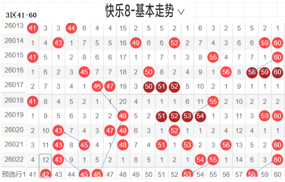 三区(41-60):遗漏5期以下有15,043 54 55 60  4,温开方式,这区码数有回暖之意,可以防一手,先定胆码走势较大者,隔期,斜三连,分边号码,可重防,间隔5以上号码可以随走势选取,例如本期大冷码,走势比较大,可以做胆,通常联动可带出,分边对称的号码,本区间也有很大走势.可关注下.隐形夹角号码.做补位形态号码.都需要观察动态走势.以上是本区间的选码方法.