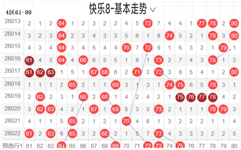四区:(61-80):遗漏5(5)以下有18,061 63 65 68 73  5,平均温开方式,上期开出5,区间回暖,后区可防,区间从以往数据来看,重码很强,一枝独秀的存在,近期有回补走热的趋势,区间回暖,本区间后区可防,与一区相比,也是温区.,对称下落,隔期回补码,可以防,这区对呈对称三角关系的胆码,斜三连有走势的胆码,联动落位码,都有各自的走向落位关系,根据走势选择一种方式选码.