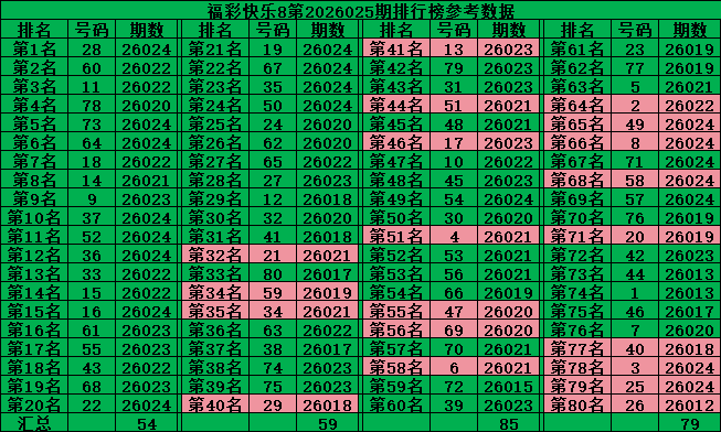 最后再把号码分为四区:一区01-20号、二区21-40号、三区41-60号、四区61-80号,理论上每个区每期应该开出5个号码: