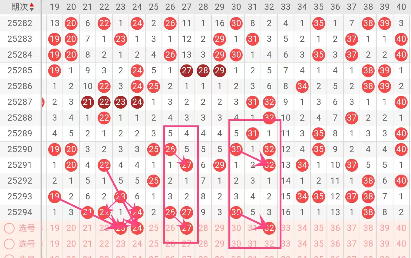 27(291、294期开出):二区“21-40段”节奏型热号。节奏呈“291期出号→292-293期休整两期→294期精准回补”的休二补一标准模型,节奏感清晰。同段22、24、26等号码近期表现活跃,形成区域性的热号集群,为27号的续热提供了良好的板块支撑。