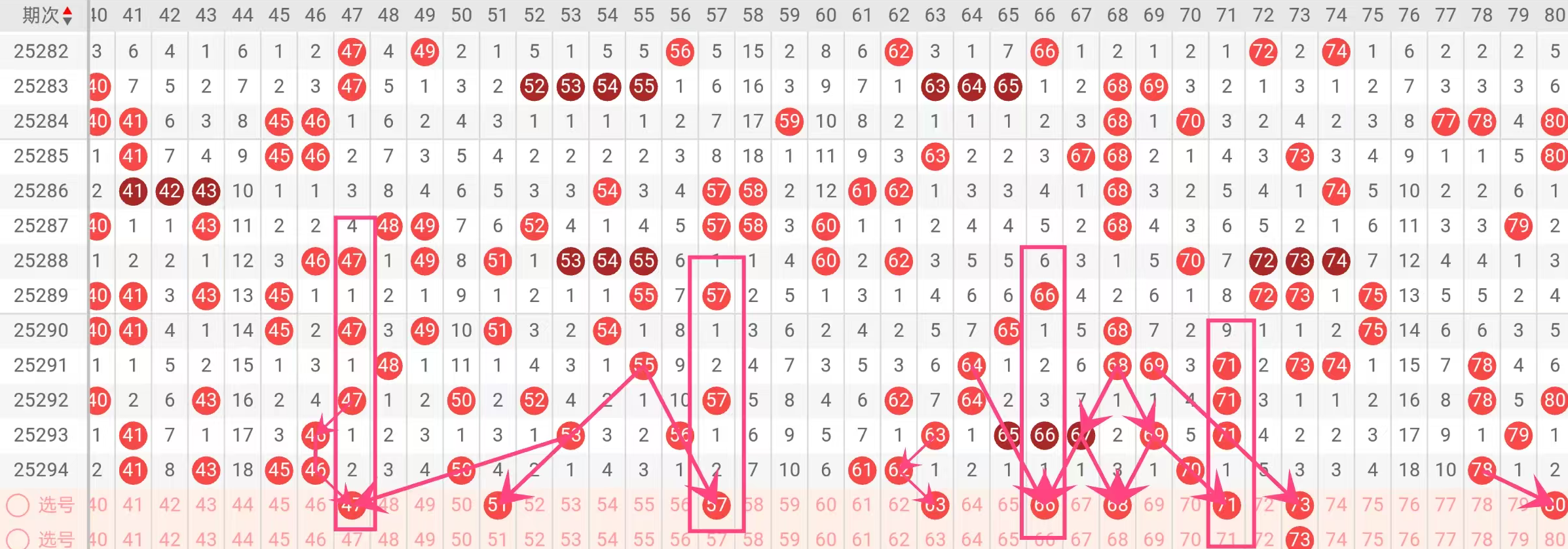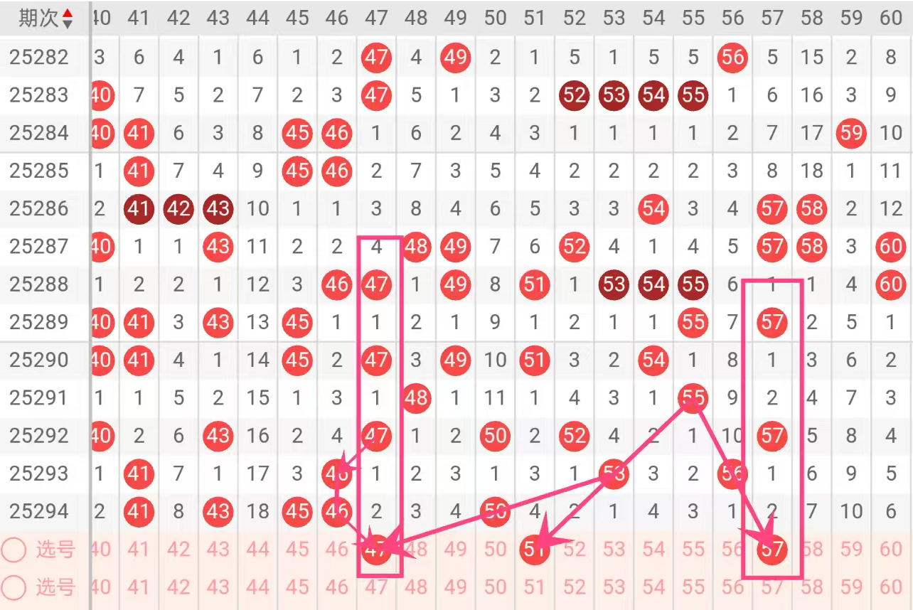 47(290、292期开出):三区“41-60段”周期型热号。节奏呈“290期出号→291期休整→292期回补→293-294期休整”的短周期波动模型。同段41、43、45、46等号码共同形成三区前段的热点区域,47号在此区域内的回补动能较为充足。