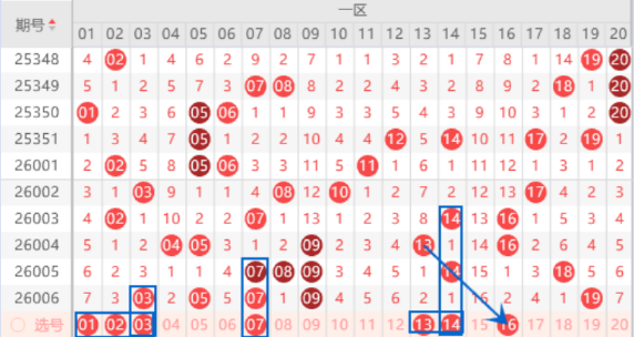 该区间的01号数字我们注意一下出号情况,本期的02号数字是属于313走势,出号机会也是有的,我们可以关注一下出号情况,所以本期我们可以防守一下01 02号数字同出的情况。上期开出了03 05 07 09号数字,本期我们注意一下出一个重号的情况,其中的03 07号数字可以重点关注一下。本期的14号数字是属于空一对称号码,本期是有机会出号的,我们防守一下13 14号数字同出的情况。