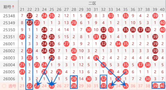 该区间的22号数字是属于空三对称号码,出号机会是有的,我们可以防守一下22 23号数字同出的情况。本期的25号数字我们注意一下出号情况,本期可以防守一下25 28号数字同出的情况。上期开出了28 30 32 34号数字,本期我们注意一下出一个重号的情况,其中的28 32号数字可以重点关注一下出重号的情况。本期的33 35号数字是属于交叉对称号码,是有机会出一个号码的,我们可以关注一下。本期的40号数字是属于对称三斜连号码,出号机会是有的,我们可以防守一下39 40号数字同出的情况。