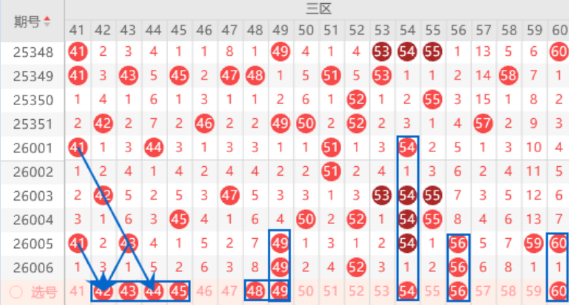该区间的42号数字是属于夹号回补号码,出号机会是有的,我们可以关注一下。本期的44号数字是属于斜连号码,出号机会是有的,本期可以防守一下44 45号数字同出的情况。本期的49号数字我们注意一下出三重的情况,本期可以防守一下48 49号数字同出的情况。本期的53 54 55号数字是属于重号54号数字的边号回补号码,本期是有机会出一个号码的,我们重点关注一下53 54号数字出一个号码的情况就行了。