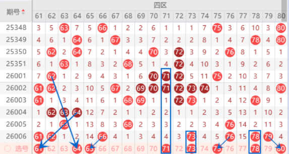 该区间的61号数字是属于对应四斜连号码,出号机会是有的,我们可以关注一下出号情况,本期可以防守一下61 64号数字同出的情况。本期的65号数字也是有出号机会的,我们可以关注一下65 70号数字同出的情况。 本期的70 71号数字是属于连号落号,本期是有机会出一个号码的,我们可以关注一下。上期开出了73 76 78 79号数字,本期我们注意一下出重号的情况,其中的73 78号数字可以重点关注一下出号情况。本期的80号数字可以重点关注一下出号情况,本期可以防守一下75 80号数字同出的情况。