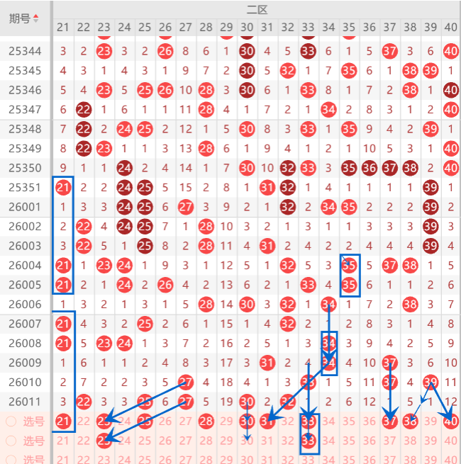 二区间注意打底号是21.22.23.25.29.30.31.33.36.37.中关注3-4码开出机会。