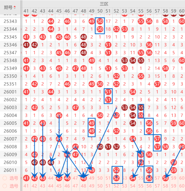 三区间在近期的走势上分析,上期三区间开出了4码,而且整体区间还是一个温热形态,上期三区间开出的形态是对称形态和重号走势,上期小妹在文章布局到了2码开出,那么本期三区间我们要重点关注的形态是隔期回补,孤码分边,空位回补,首先我们注意隔期回补上的42.43.中防守一码回补机会,而孤码分边上的48.50.51.53中参考1-2码分边机会,至于空位回补上的45.46.54.中布局1-2码回补机会,上期重点关注在对称形态上开出了1码,那么本期重点关注在隔期回补上布局一码开出机会,如图所示。