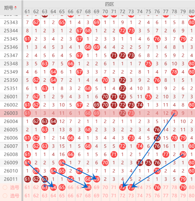 四区间的打底号是63.64.66.68.70.71.72.73.46.78.79中参考3-4码开出机会
