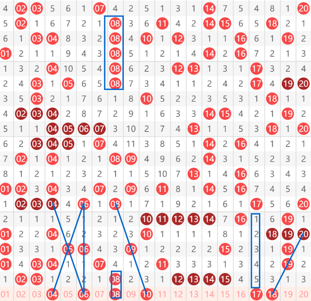 快乐8第072期01-20区域,推荐的第一个号码04号,大家可以看到04本身是个间隔一的连贯走势,同时看到06间隔2给05,再间隔2给04的一个间隔2走势。然后06号可以看到是上面0406间隔两期给0506,那么再间隔两期给06,形成一个倒三角走势。然后08中间是间隔4,然后间隔2,再间隔4,上面是4重,下面考虑08继续走重。然后就是10号,大家看到08间隔2给09,再间隔2给10的一个走势,最后就是17和18这两个号码,17号是中间两个间隔期,上面一个间隔5,下面是个对称走势,而十八号看到20,接着19给出18,形成一个完美的走势。