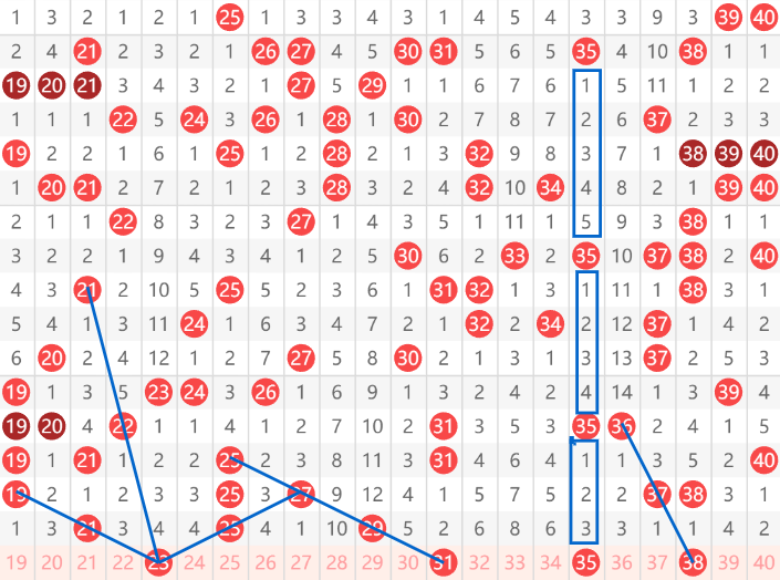 快乐8第072期20~40区域,推荐的第一个号码23号走势比较多,首先看21,间隔3给22,再间隔3给21的一个走势,同时旁边19间隔一给21,再间隔一给23的走势,以及右边27间隔一给25,再间隔一给23的一个走势。然后就是31的一个走势,看到有一个间隔一的4斜连。然后就是35,他有一个间隔5间隔4间隔3的间隔递减走势。还有38号具备一个36间隔一给37,再间隔一给38,因为向上也是同样的间隔走势。
